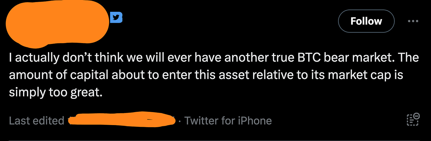 Publicly-traded operating corporations have access to better types of leverage than hedge funds and most other types of capital. Specifically, they have the ability to issue corporate bonds…often with multi-year durations. If they hold bitcoin and the price dips, they don’t have to sell prematurely. This gives them a better ability to weather periods of volatility than entities that rely on margin loans. There are still bearish scenarios that could force corporations to liquidate, but those scenarios would involve a much longer bear market occurring, thus making them less likely.