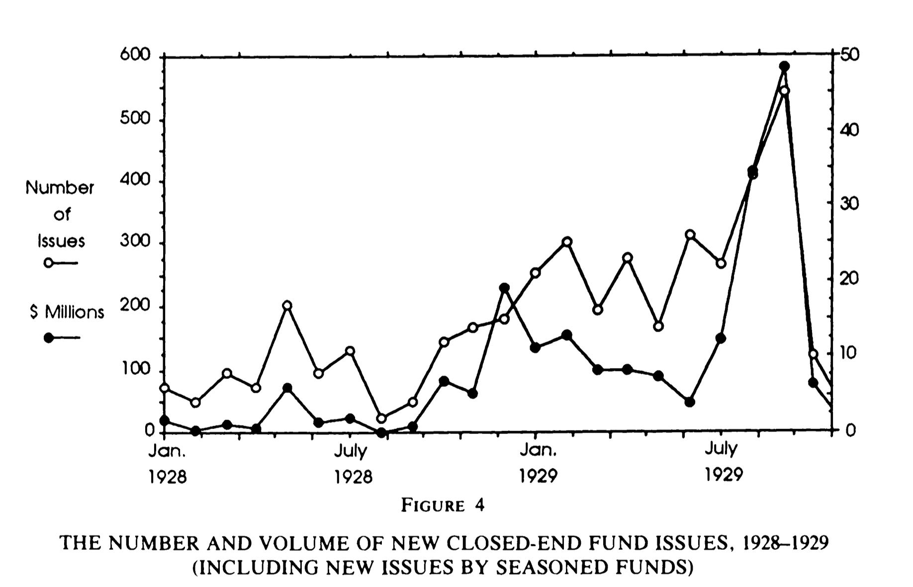 The dollar volumes of capital raised tell an equally dramatic story, accounting for 70% of all funds issued in the 1920s. New trust issuance during August and September 1929 alone amounted to $1bil—equivalent in today’s purchasing power to perhaps $20bil, or $130 billion as a proportion of today’s economy: