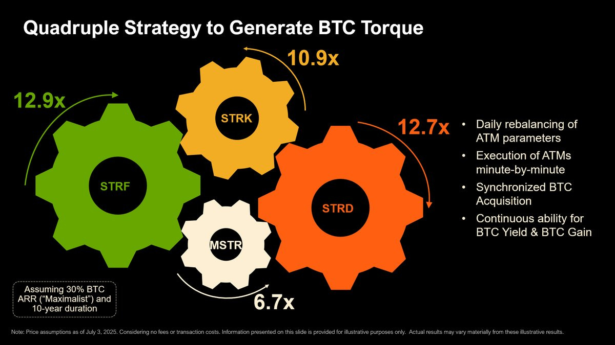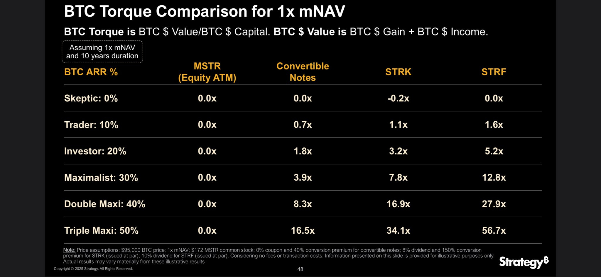 MicroStrategy helpfully provides a video and table showing the “torque”—essentially the amplified exposure to Bitcoin price movements—for different layers of its capital stack (equity, convertible notes, preferred shares, etc.):