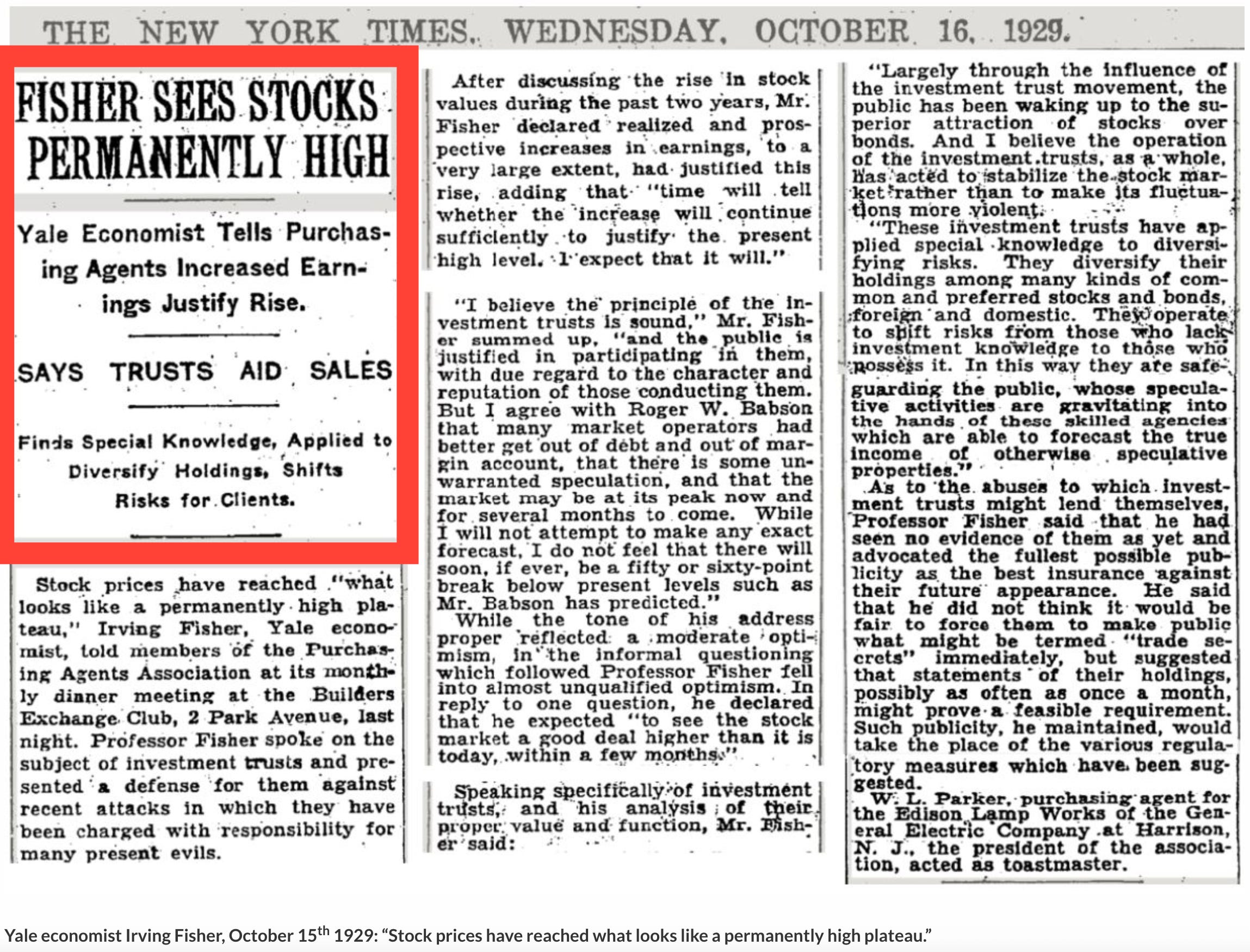 Fisher's plateau quote is now infamous, but the lesser-known context that gave rise to it tells a more revealing story. He was actually defending investment trusts as a key support for stock valuations, much as Bitcoiners cite built-in demand from Bitcoin treasuries today. The New York Times reported at the time: