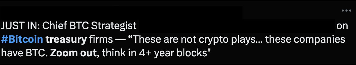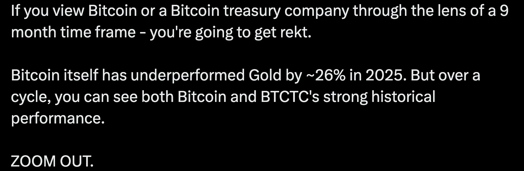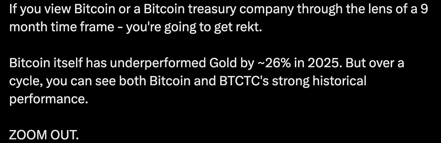 TreasuryCo managements and Bitcoin influencers frequently admonish investors to “zoom out” and focus on long-term value creation to understand BTCTCs: