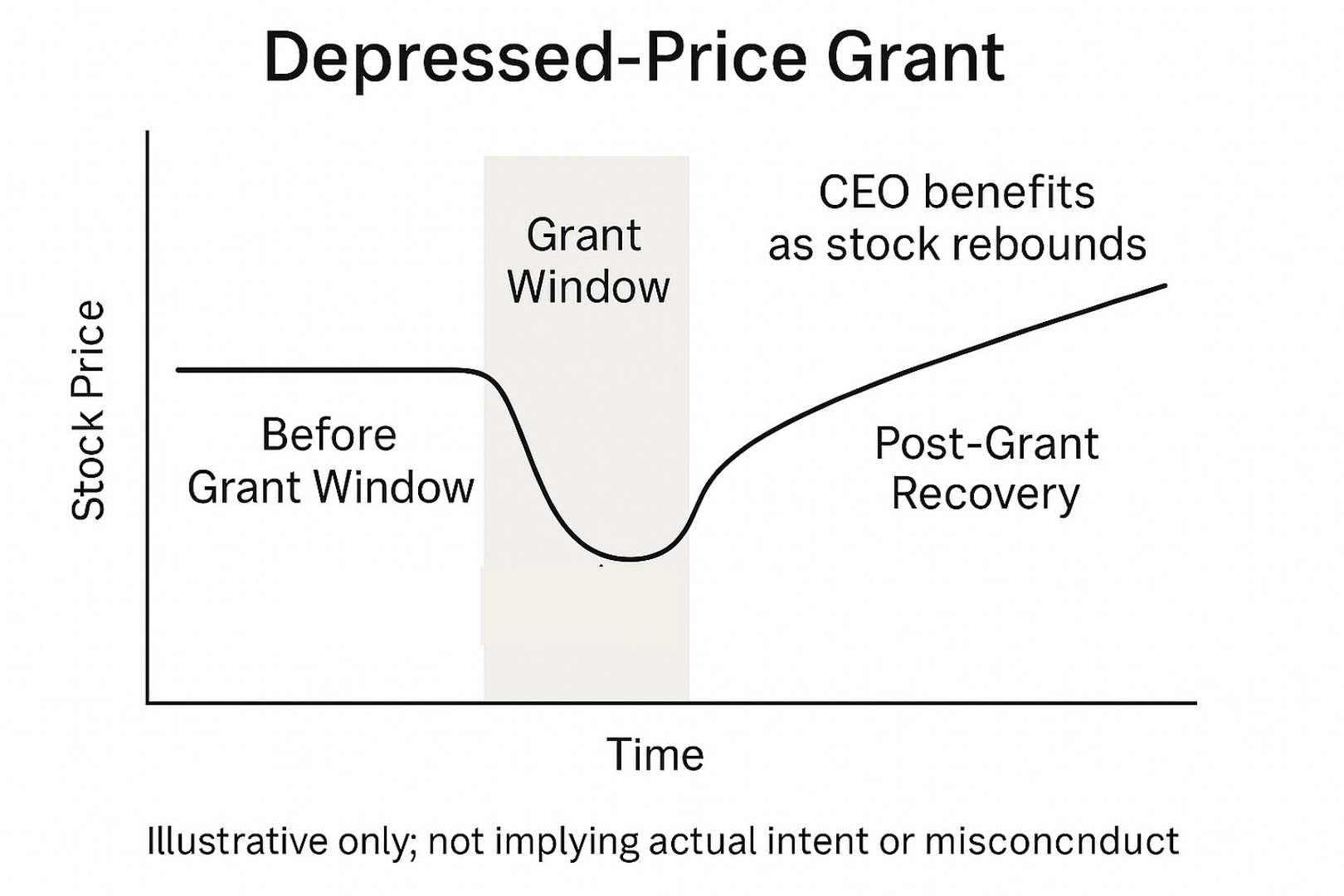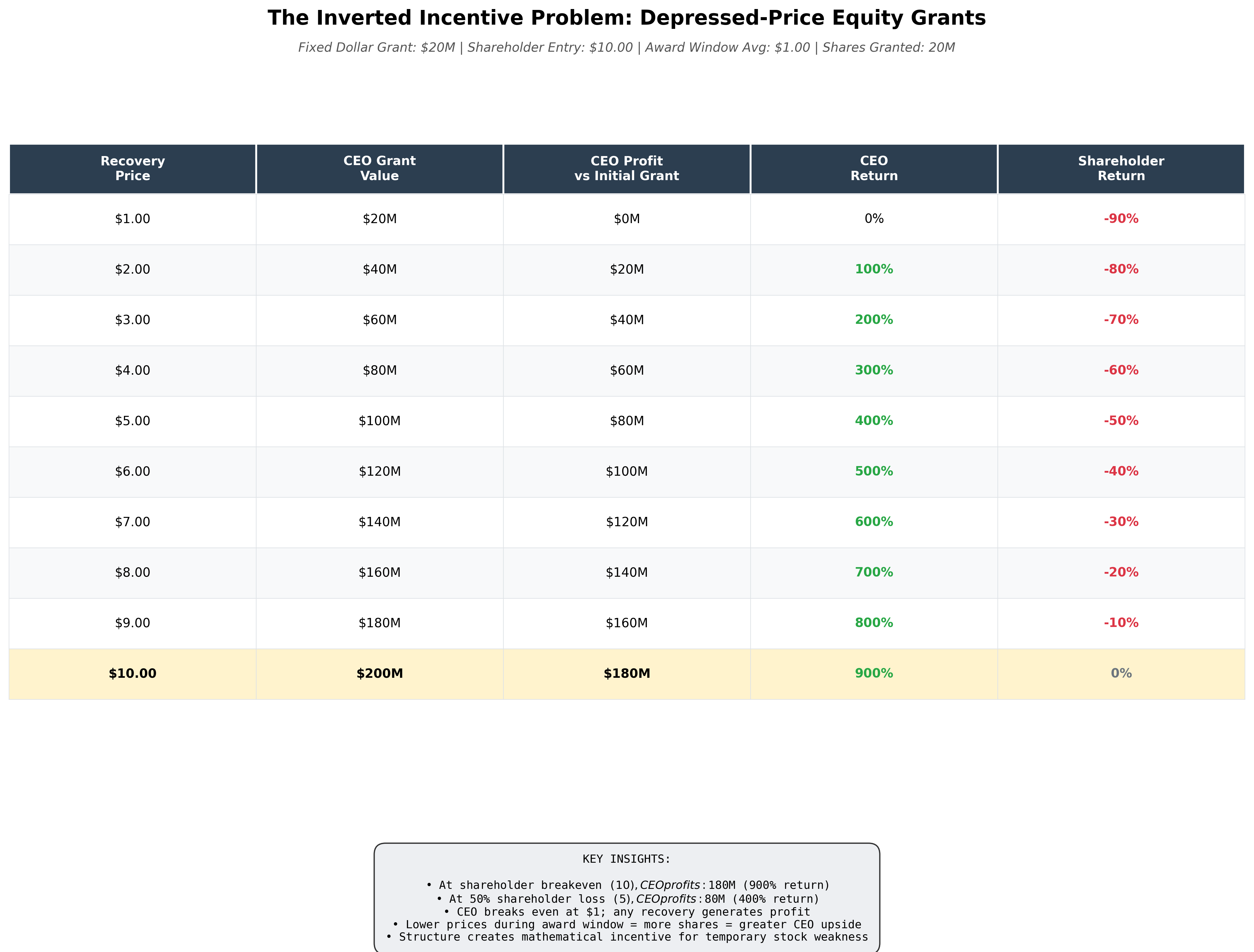 The illustrative table below, using a hypothetical scenario, highlights the striking inversion of incentives with this sort of grant: the worse the short-term stock performance, the richer management’s payday upon rebound: