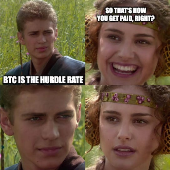 For anyone possessing the skill to read between the lines, the message is written in comically large, blazing neon letters: they do not truly believe that they can outperform Bitcoin as a benchmark. That is precisely why their compensation agreements are written the way they are.