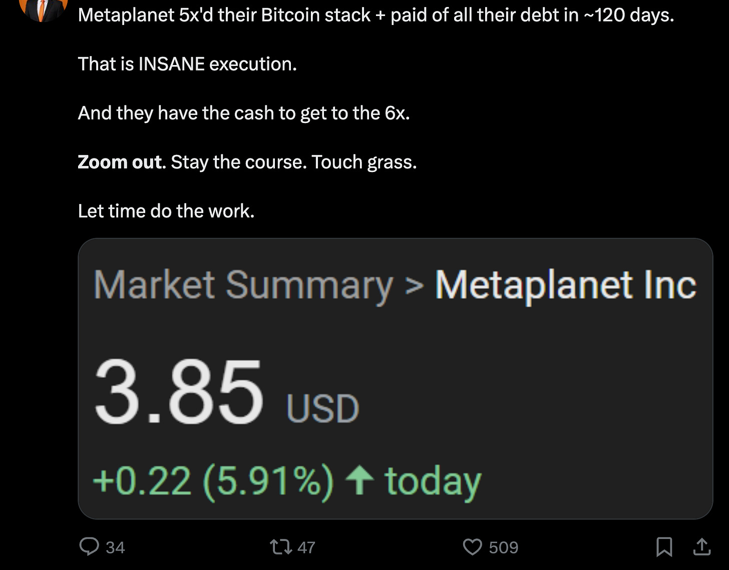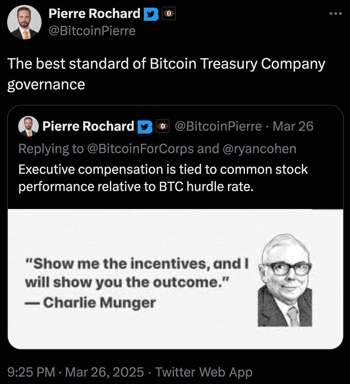 Pierre has succinctly articulated what should be the non-negotiable foundation of every Bitcoin Treasury Company: a standard so self-evidently correct that any deviation from it likely becomes an instant disqualification for long-term investors. Just as Bitcoin’s integrity relies on “proof of work,” BTCTC integrity relies on “proof of alignment”—compensation structures that are tied solely to outperforming Bitcoin over the long term.