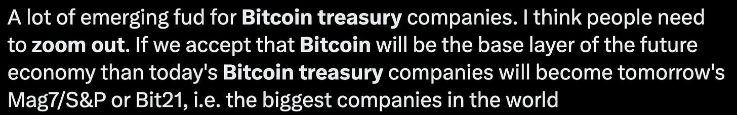As we demonstrated in Steal This Prompt, BTCTCs are highly path-dependent—only the narrowest set of future scenarios are likely to avoid disappointment for long-term BTCTC shareholders. During a BTCTC bull market, new competitive entrants emerge and existing BTCTCs dilute shareholders through exponentially-increasing share issuance and insider compensation structures that cap BTCTC upside versus Bitcoin. If the BTCTCs enter a bear market loaded with too much leverage, or if their stocks trade below the value of their underlying Bitcoin holdings for an extended period, it’s likely game over.